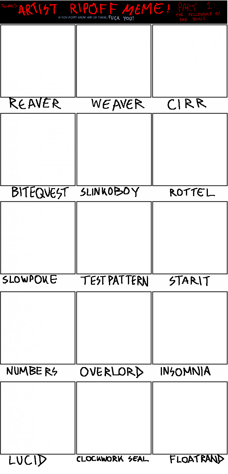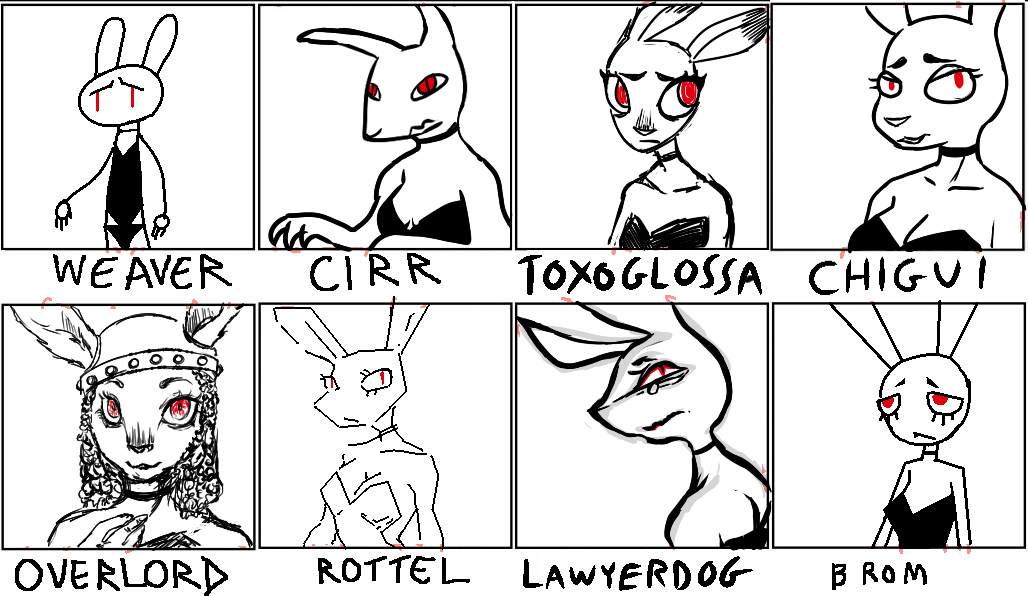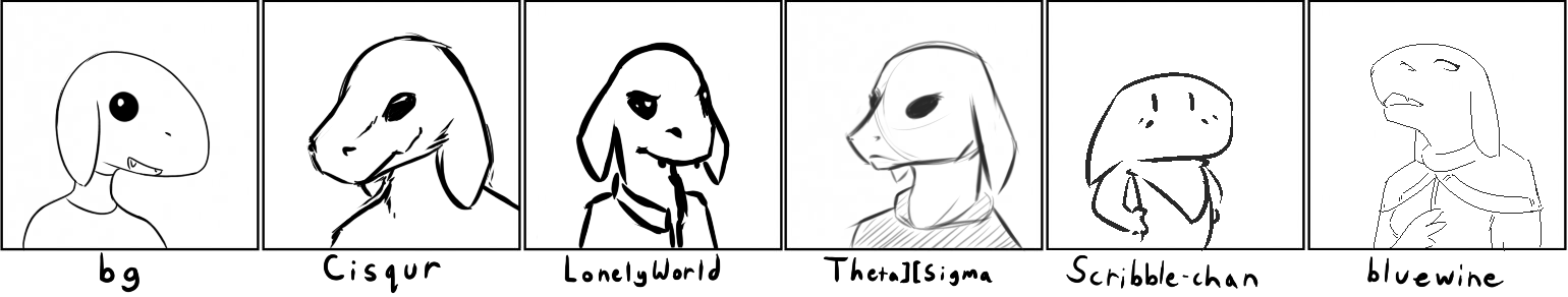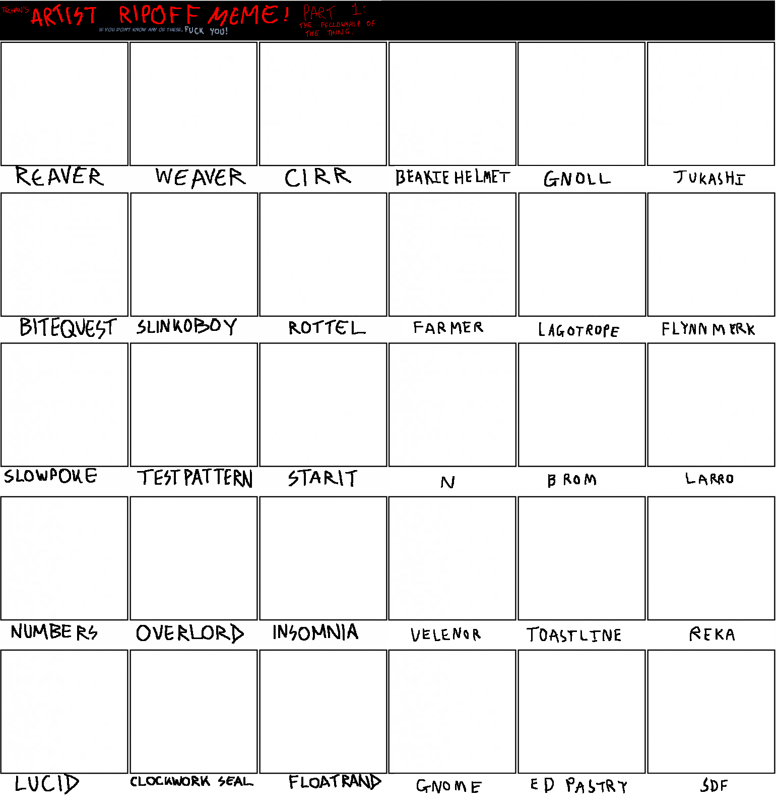 Reaver, Weaver, Cirr, Breakie Helmet, Gnoll, Jukashi, Bitequest, Slinkoboy, Rottel, Farmer, Lagotrope, Flynnmark, Slowpoke, Test Pattern, Starit, N, Brom, and Larro are all the artists behind it, so far, I think. Pretty sure it's just a comparison, not one person emulating everybody's styles?