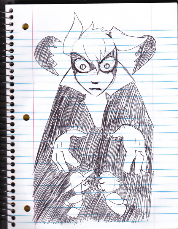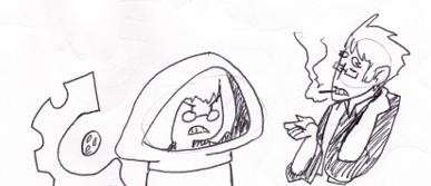 "BUT, if there is some way you could help me... i might as well tell you what happened. A long long long time ago, there was a civil war between the monstrous races and the humanoids. It was deadly fierce and it seemed that the monsters would win. Suddenly, from out of nowher, this awkward gentlemen appeared and wanted to do business. As i recall he wanted to trade a giant thing-which was very impressive- and only needed to be trained in how to make void conduits. I remember the strange fellow as if it were yesterday, he had wild hair similar to that of a lions mane. One big eye and one little eye. And the letters T and S sewn to his garb. I had apprenticed him for only a little time when he suddenly betrayed us, stole the conduits that we had already made, along with the tools used to make them, set my lab on fire, and vanished as abruptly as he appeared. To make matters worse, i also believe he had something to do with the clash of thunder in the forest that was to the south of us- which in turn lead to the cracking of yon planet.