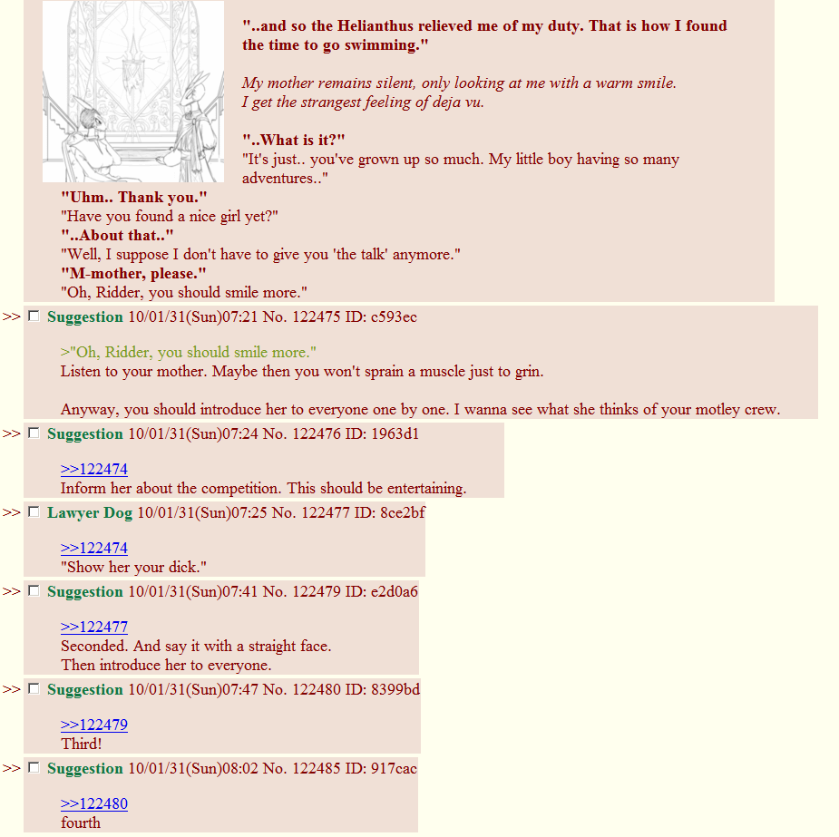 See the thing here is is that honestly Sticks is about as good a choice for Ridder, as Muschio is for Finesse (actually that's a lie, Stick's should not be compared down to a bastard like Muschio despite her flighty nature). Finnie deserves rather better and may only like the guy because she's build up this insulated fantasy around him because of his family's past nobility. She can't afford not to like him because otherwise all of her time, all of her life's work to get noticed, to be successful... was meaningless. She never may have really expected, but when Fate/We dropped a curveball in her lap like she could have never caught on her own she has clung to it an will not let go to save her life. I only want to see Muschio get a good end, not for his sake, but for her's alone. If he... if he fucks up the 'only' GOOD thing he has going for him, my pent up wrath and spite will drop on him like a load of lead bricks!