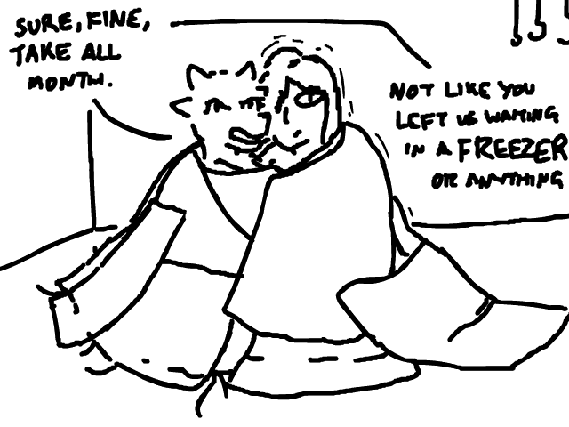 If we had more tozol stories, then most likely they'd run into the same problem of mostly getting wrecked (which happened to Penji, really), because the alternative would be for them to seem overpowered all the time. Even a small pack of tozols would be very difficult to write around, because what problems can't be solved by throwing tozols at it? Even the non-tozol characters' thinking would center around using or avoiding the tozols (again, this sort of happened to Penji). I'm not saying it can't be done (I definitely want to see more tozol stories!), but it would be very difficult.