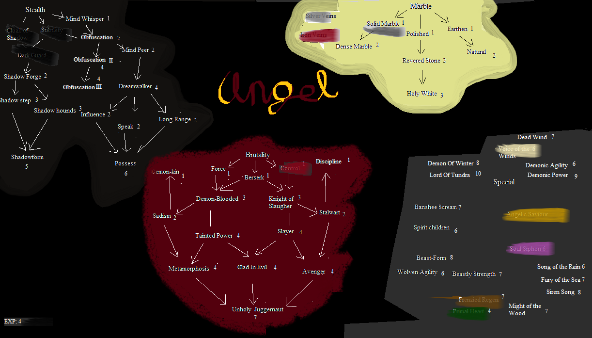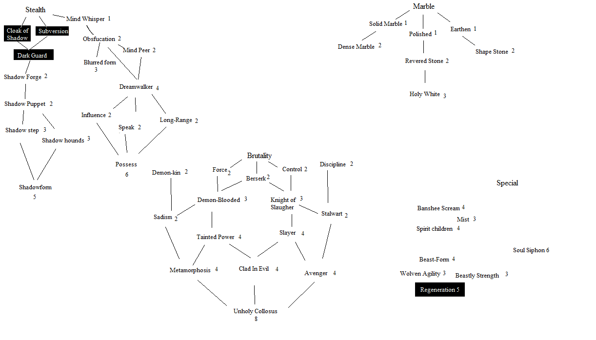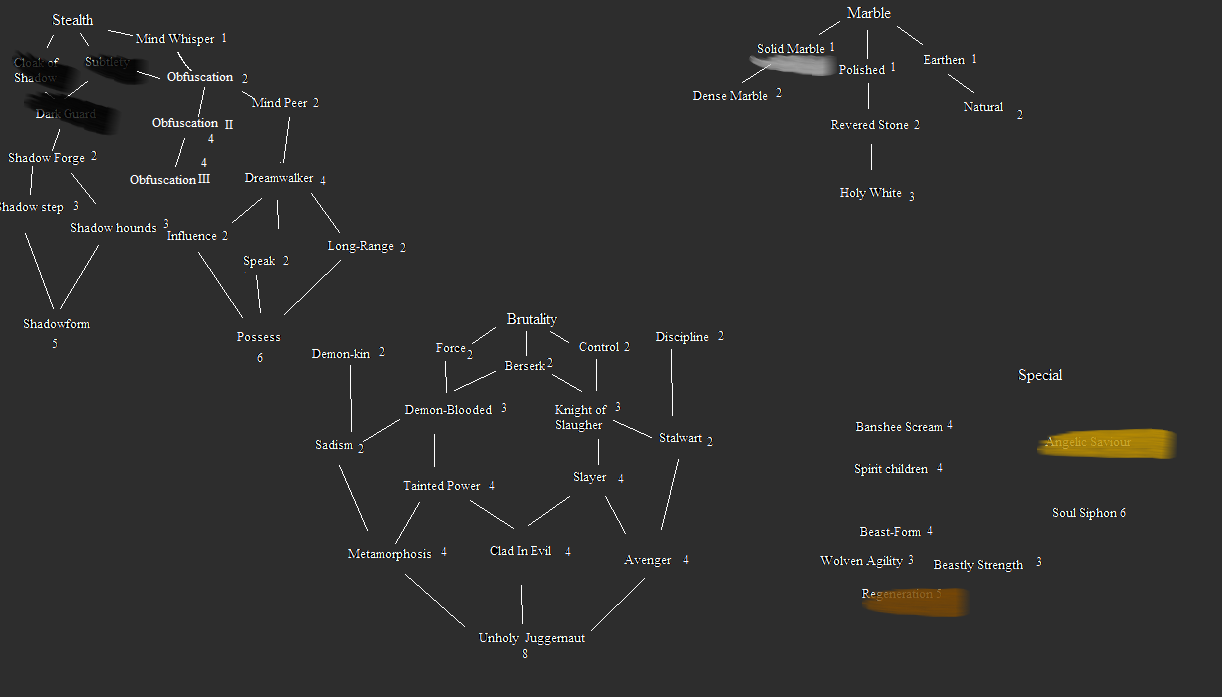 Fae/Demon would be controlled monster creation: combining Fae's animal manipulation with Demon's monster creation. Creation of werewolves, in other words. Also the creation of a Hell dimension (a special place for monsters, essentially, inimical to mortals), combining Fae land-creation with Demon desecration.