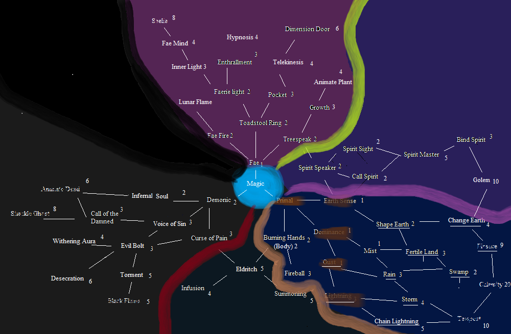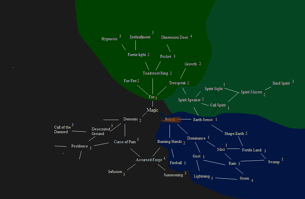 Primal, going from Earthsense, is becoming a creature of the earth. For a related theme, fire, for something akin to 'primal forces of creation' as the overarching theme. Thus, spells of this category manipulate the material surroundings, at higher levels shaping the battlefield and then recreating of terrain ex nihilo(?).