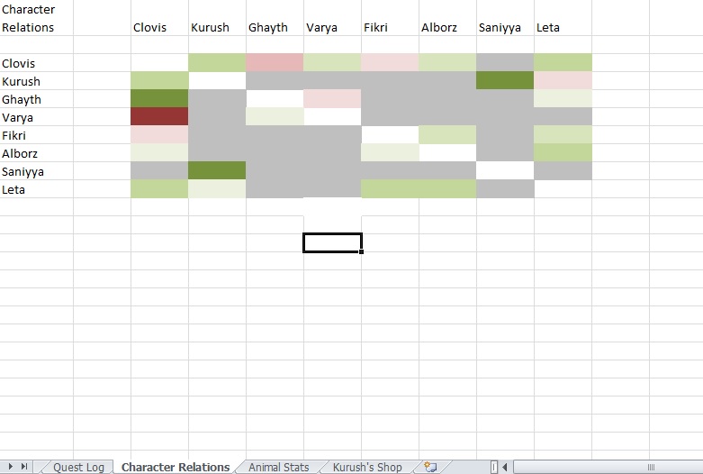 Left hand column is the "base" character, the top column is the character their feelings are in regard to. Green indicates favoritism, red indicates dislike. The darker the color, the more they like or dislike that character. Gray means they haven't met yet. Clovis' feelings are naturally based on the player's reactions towards characters. If you have any questions on how to read it, feel free to ask and I will try to explain less shittily.