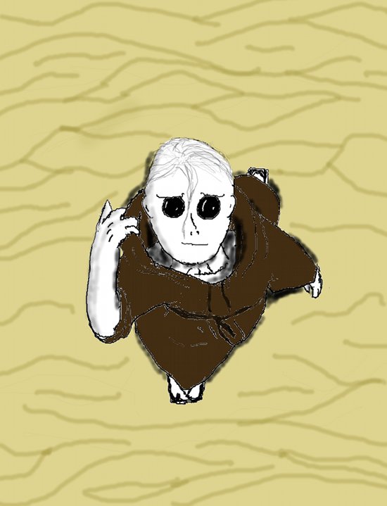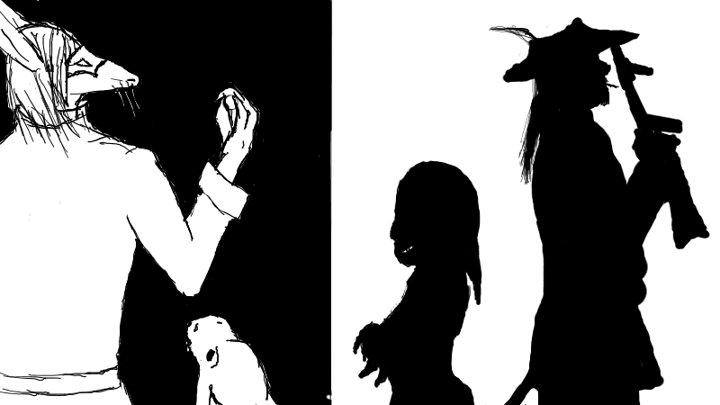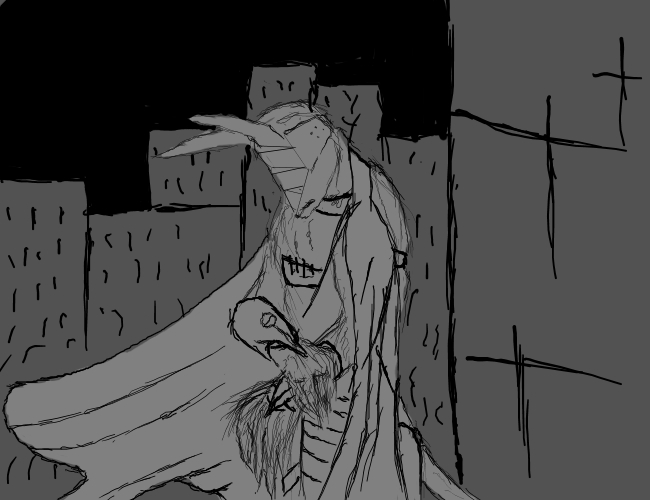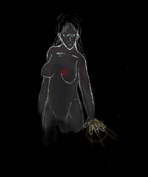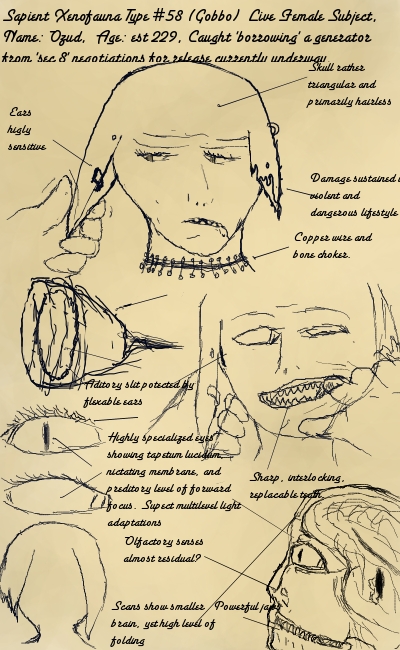 Female, late adolescence, notable contrast to male in having a singular discolored eye, as well as lacking the large ears of the male. Scans show massively deformed skull and brain structure to allow for this eye and even cursory examination reveals crude scars where the ears would be (female circumcision? occult sign? criminal penalty?)