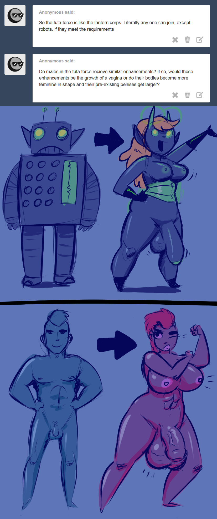 The vast majority of Futa Force members are not hermaphrodites and have not had their bodies altered beyond the minimum required for space travel (such as lungs capable of breathing a wider range of atmospheres).