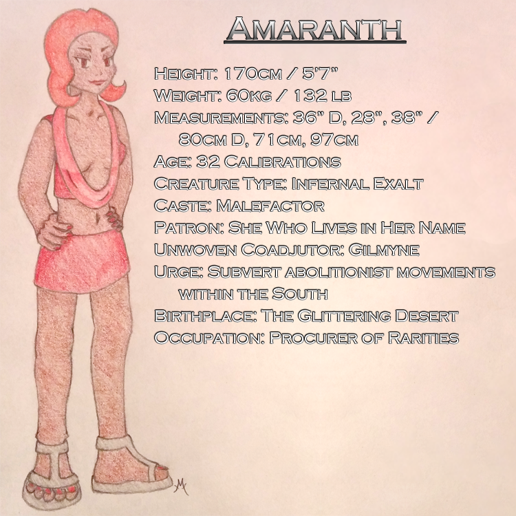 "First, and most powerful, there are the Anathema of the Sun and Moon. The Anathema of the Sun are awful monsters or demons or something that stole the Sun's power for themselves. Every now and then, one will show up in the Threshold, and a Wyld Hunt will be called to kill it. There have been a lot more of these kinds of Anathema since the Empress disappeared, five years ago.