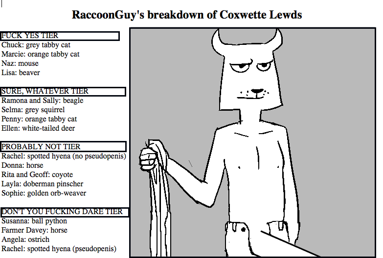 Which, fair enough I guess. The few scenes Coxwette has had were a maybe little more explicit. A little. I don't feel comfortable dragging Enemy Quest into this discussion too much, but the level of detail described is still pretty similar, even if the level of detail on the art isn't as high. Also, maybe consider that Enemy Quest has many, many more (slightly less) explicit sex scenes than Coxwette. Like several per thread if I recall.