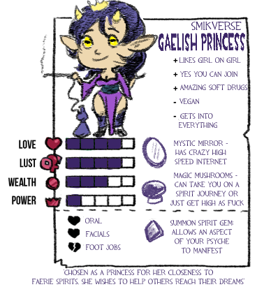 Seven need to be culled or merged and I'd like to get opinions on who. If people have ideas for races or items or traits for certain princesses, please go ahead. I'd like most princesses to be referencing at least three different quests!