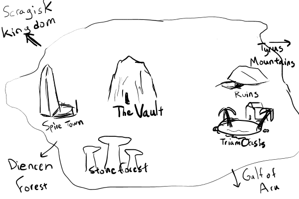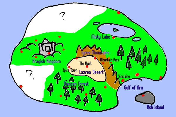 The center of the caldera is dominated by a massive stone spire, almost a kilometre in width at it's peak. This is the remains of a smaller extinct volcano which formed within the caldera ages ago, and then was eroded away, leaving only the hardened magma 'throat'. The spire was dubbed "The Dragons' Perch" by the caldera-dwellers, as large winged shapes are occasionally spotted circling the top, and one of the most infamous attempts to scale the spire by a group of adventurers ended apparently in tragedy as only one survivor made it back to the nearest town. He spoke of a massive winged shape diving suddenly down from the peak, and strafing the climbing adventurers with flames from its mouth.